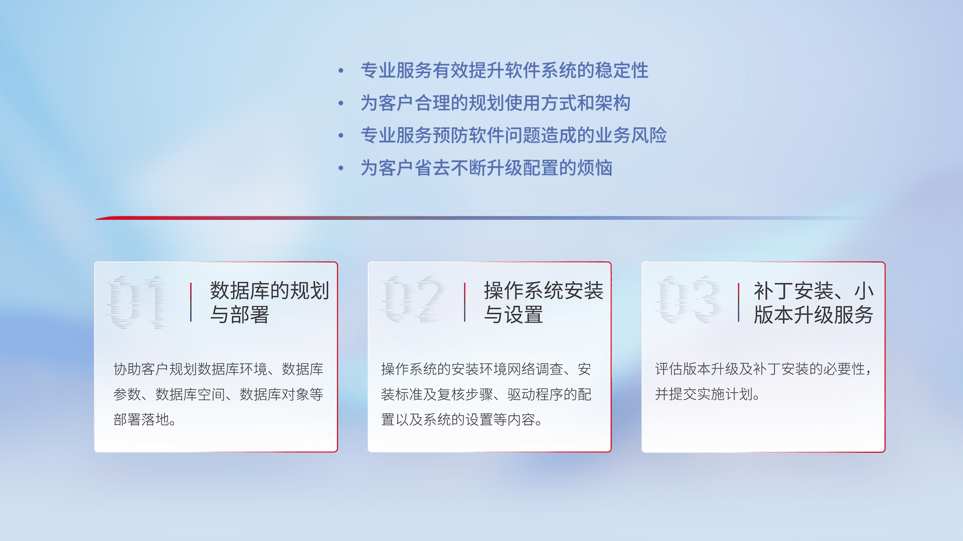 为客户提供软件规模升级、、快速部署、、按需配置的专业服务,,从数据库的规划与部署到操作系统的安装与设置,,再到补丁安装和小版本升级提供支持。。。